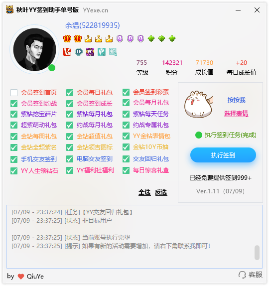 - 拥有30项任务,YY会员签到、各种会员/紫钻/金钻/约战礼包领奖任务、YY人生钻石任务