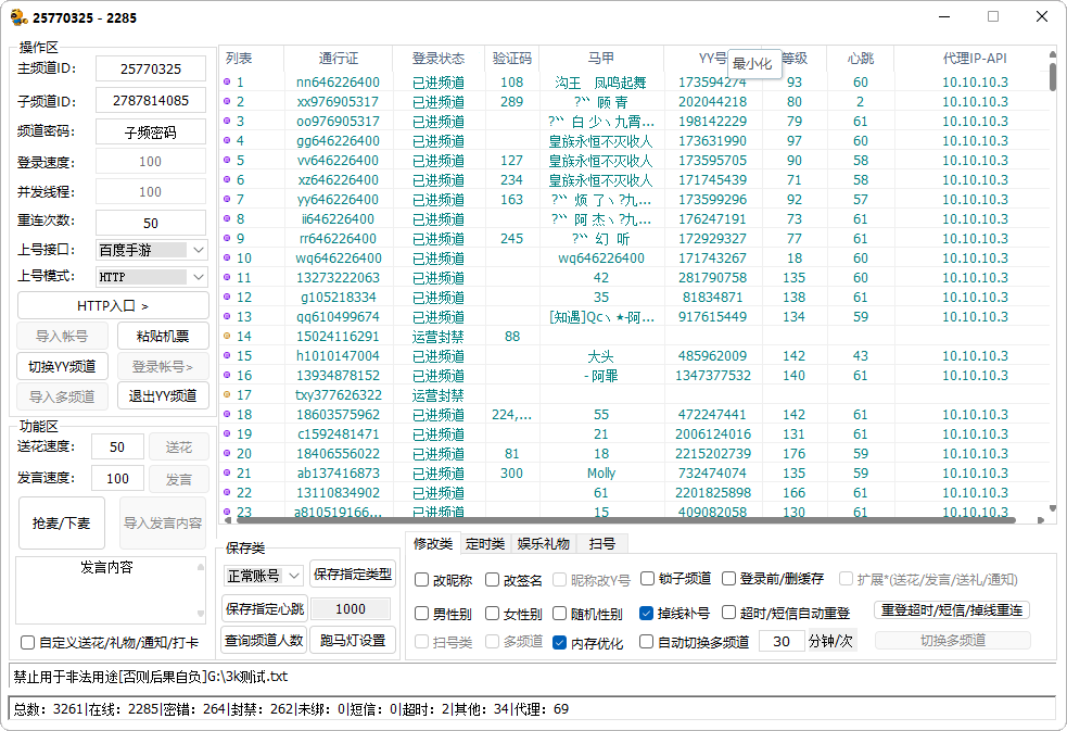 [特色功能] 改昵称/签名/性别、送花/发言/抢麦、进入密码频道、导出指定状态帐号、及刷礼物功能